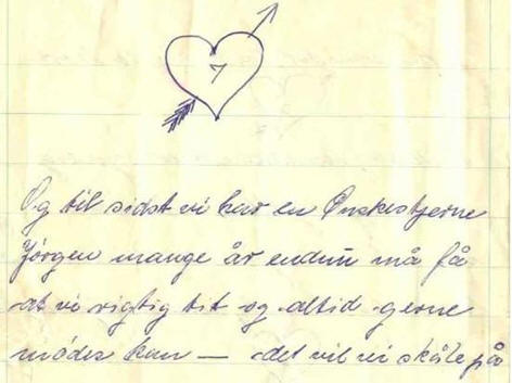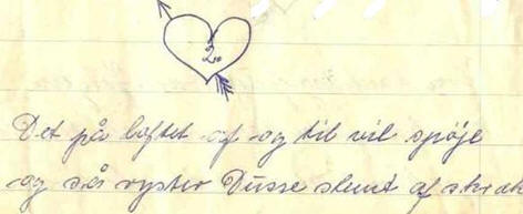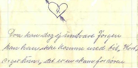Jørgens svigerdatter Grethe Madsen (A10.2,gen.4) fortæller: Efter Edelines død i 1949 flyttede Jørgen til en ældrebolig på Gl. Vardevej 55. Her kom han rigtig på den grønne gren og fik hele 3 kærester. Dusse, Dora og Thilde, hed de. De skrev breve til ham med små sløjfer på og meget andet. |